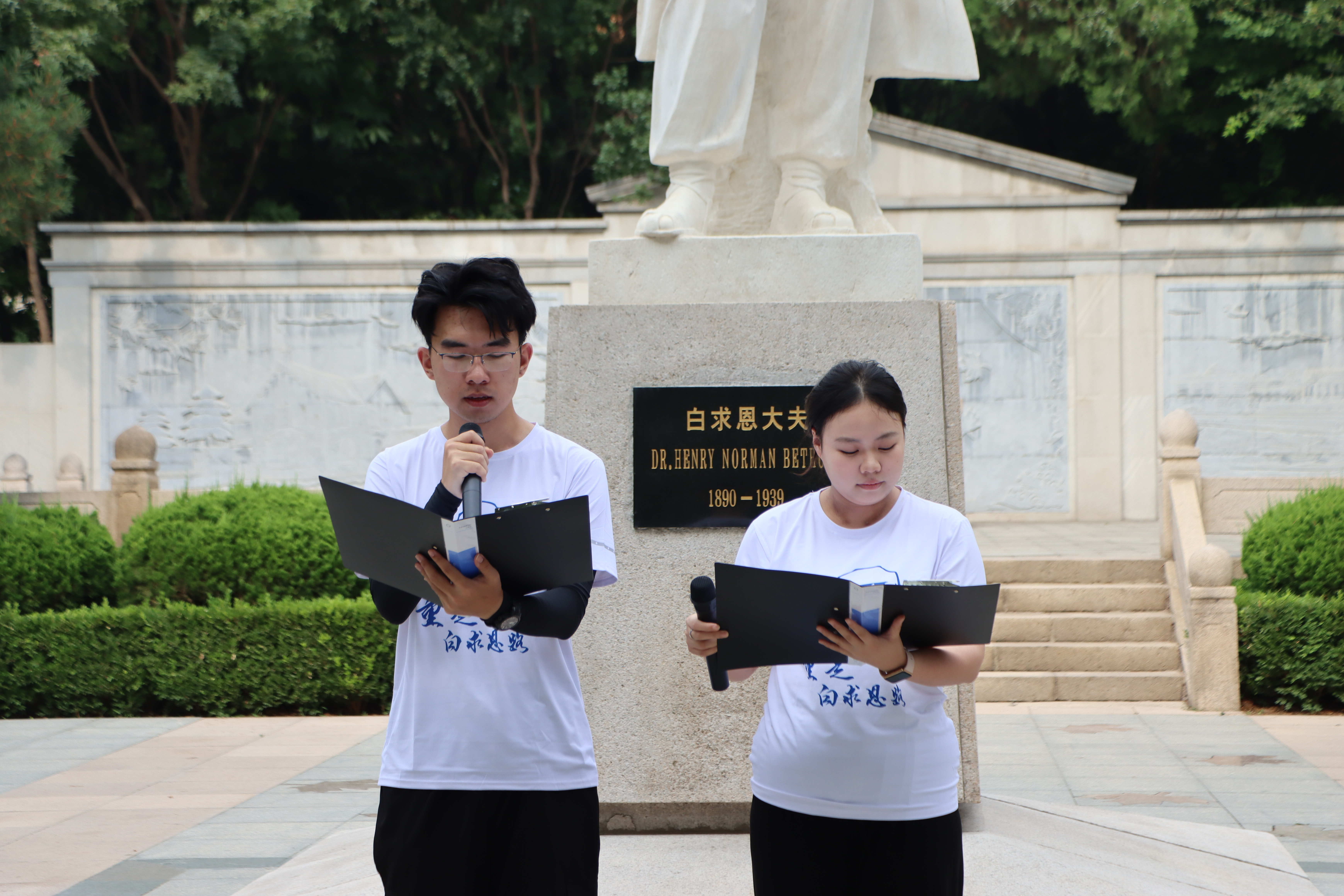 在白求恩墓前,全体师生面向白求恩像默哀一分钟,在无声静默中表达对白求恩同志的深切哀思。新葡萄88805官网与基础医学院学生代表共同朗诵《纪念白求恩》,在声声朗诵中抒发对白求恩同志的敬佩与怀念,表达弘扬和践行白求恩精神的决心。随后,学生代表向白求恩墓敬献花篮,队员们依次向白求恩墓献花。公共卫生学院学生代表发言,表明作为一名医学生,要坚定信念信心,传承发扬国际主义精神。新葡萄88805官网关工委副主任、离退休党委纪委委员傅菁林老师致辞,叮嘱志愿者们要赓续红色血脉,做白求恩精神的传承者。最后,全体师生重温医学生誓言,誓言声阵阵入耳,明医志、慰英灵。